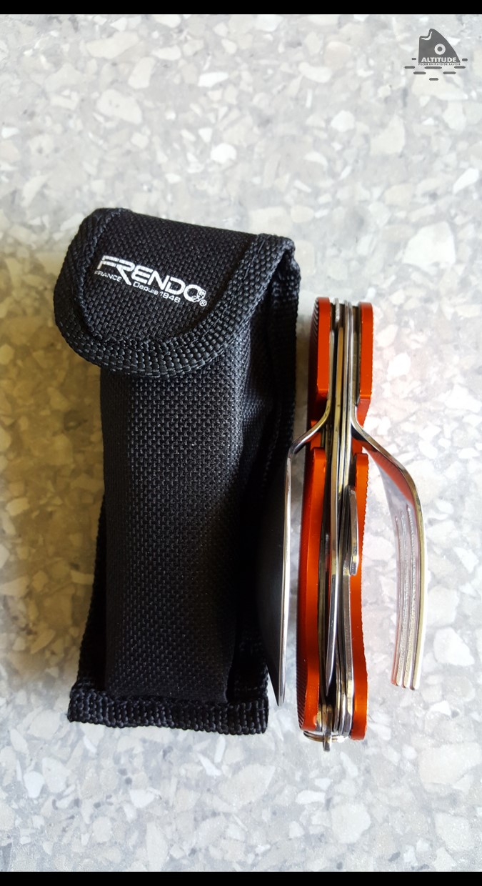 Ces couverts sont en acier inoxydable avec un manche en aluminium pour un poids de 130 gr. Les dimensions plié L10 x l4 x 3,2 cm et déplié L17,5 x l3,2 x 1,5 cm.